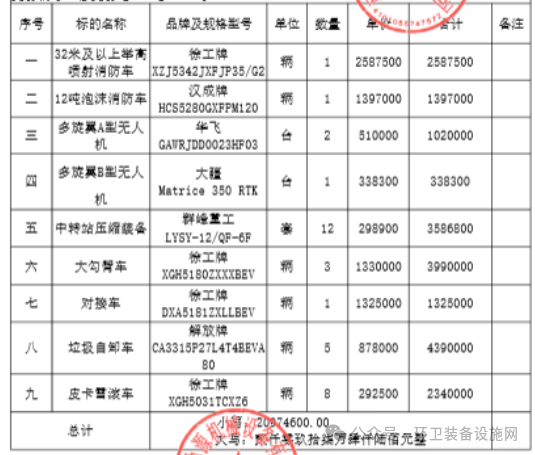 采購需求:32米及以上舉高噴射消防車1輛、12噸泡沫消防車1輛、多旋翼A型無人機2臺、多旋翼B型無人機1臺、中轉(zhuǎn)站壓縮設(shè)備12套、大勾臂車3輛、對接車1輛、垃圾自卸車5輛、皮卡雪滾車8輛。