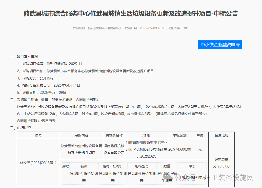 環(huán)衛(wèi)在線網(wǎng)訊,5月9日,河南省焦作市修武縣城市綜合服務(wù)中心發(fā)布修武縣城市綜合服務(wù)中心修武縣城鎮(zhèn)生活垃圾設(shè)備更新及改造提升項目中標公告,河南鼎源機械設(shè)備有限公司中標,中標金額合計2097.46萬元。