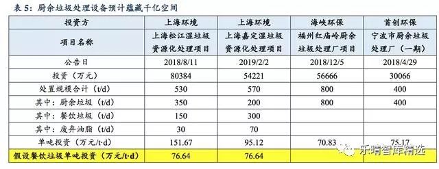 廚余垃圾投資市場蘊(yùn)藏千億空間。以100個(gè)餐廚垃圾試點(diǎn)城市的平均餐廚垃圾項(xiàng)目單噸投資額76.6萬元/天、處理費(fèi)197元作為合理估計(jì)值,可得上海環(huán)境松江、上海環(huán)境嘉定、海峽環(huán)保福州、首創(chuàng)環(huán)保寧波(一期)4個(gè)項(xiàng)目的平均廚余垃圾單噸投資額為141.5(萬元/t·d)。