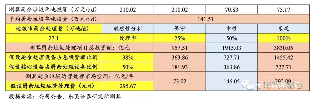 隨著垃圾分類政策的不斷推行,廚余垃圾處理市場、環(huán)衛(wèi)設(shè)備市場及環(huán)衛(wèi)服務(wù)市場需求將會(huì)逐步釋放。結(jié)合實(shí)際情況考慮,廚余垃圾總投資/處理設(shè)備/運(yùn)營處理市場均為中性情景下的測算值(即垃圾分類完成率為50%),前中端的廚余清運(yùn)裝備/清運(yùn)服務(wù)/垃圾分類運(yùn)營市場空間均為樂觀情景下的測算值(即垃圾分類完成率為100%,考慮最大容量)。