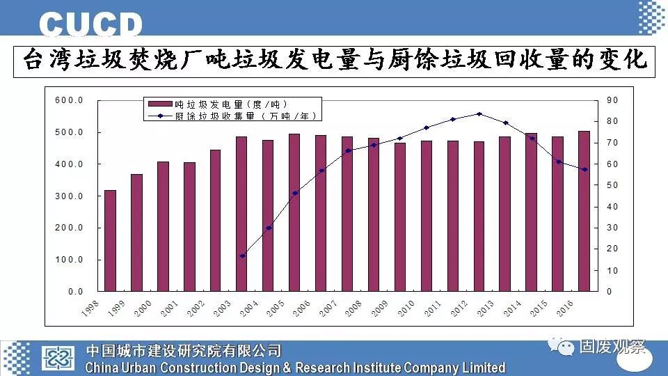 下面這張圖可以看出臺(tái)灣地區(qū)的廚余回收量的變化對(duì)焚燒發(fā)電效率的影響基本沒(méi)有。臺(tái)灣地區(qū)雖然聲稱廚余垃圾分類(lèi)收集做得好,但廚余垃圾的回收利用要明顯落后,臺(tái)灣第一個(gè)廚余垃圾厭氧處理廠今年才動(dòng)工,計(jì)劃2018年底才能投入運(yùn)營(yíng)。
