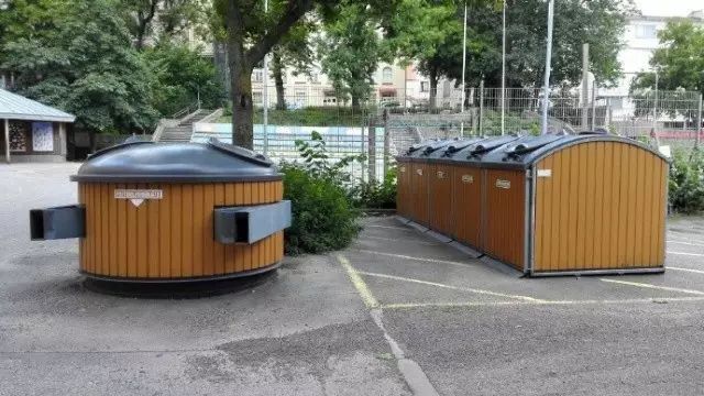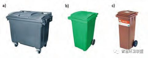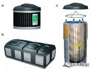 為了進(jìn)行廢物的投放,產(chǎn)業(yè)所有者或物業(yè)管理公司應(yīng)當(dāng)為住宅提供生活垃圾的投放點。投放時采用的容器分為普通容器(更為常用)和埋入式容器(正在普及)兩種。常用的普通投放容器分別為140升(圖8中c)、240升(圖8中b)、600升(圖8中a)這三種。普通投放容器的缺點是,雖然容積不大,但卻會占據(jù)將對較大的空間。埋入式容器部分設(shè)置于地下,內(nèi)部配備高強(qiáng)度織物容納袋,容納能力遠(yuǎn)高于普通容器,能夠在節(jié)省空間的同時,起到降低收運頻次的作用。收運時,收運車輛會將織物袋從容器中取出,通過打開袋底的機(jī)關(guān)清空廢物。