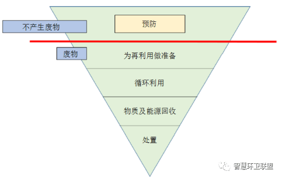 金字塔中的預(yù)防指:在設(shè)計和制造產(chǎn)品的過程中,盡量減少原料的使用量;延長產(chǎn)品的使用壽命;減少有害物質(zhì)的使用量。為再利用做準(zhǔn)備指:對產(chǎn)品的整體或部件進(jìn)行檢查、清理、修理、翻新等工作。循環(huán)利用指:使用廢物生產(chǎn)新的物質(zhì)或產(chǎn)品,包括堆肥。其他回收手段指:使用厭氧消化、焚燒發(fā)電、氣化等手段產(chǎn)生能量(包括燃料、熱、電)和一些物料(可以用作回填物)。處置指:填埋和沒有能量回收手段的焚燒。