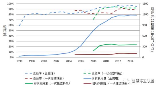 芬蘭的押金體系實現(xiàn)了極高的回收率。在PALPA體系剛剛成立的1996年,一次性金屬罐的回收率就已經(jīng)達(dá)到了59%,并馬上于第二年上升到了79%。到了2009年,金屬罐的回收率已經(jīng)超過90%。同樣地,PET瓶的押金體系在2008年開始實施時,返還率就已經(jīng)達(dá)到了71%,之后在兩年內(nèi)便上升到了90%以上。玻璃瓶在芬蘭擁有很長的押金制度實施積累,因此在PALPA在建立針對玻璃瓶的回收體系后,回收率就一直高于80%。從圖11還可以看出,一次性鐵罐的回收量自2004年起至2012年,一直都在迅速上升,并且保持穩(wěn)定的高回收率,反映出芬蘭飲料產(chǎn)業(yè)使用一次性金屬罐替代可重復(fù)使用玻璃瓶的趨勢??芍貜?fù)使用玻璃瓶的回收率則更高,在2014年時為97%、2015年時為98%。