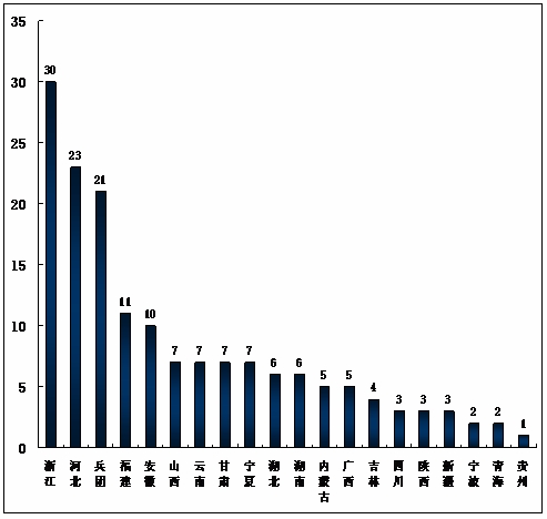 從地區(qū)分布看,浙江、河北、新疆生產建設兵團、福建、安徽簽約項目較多,分別為30、23、21、11、10個。第一批簽約項目較多的云南、山東、安徽、貴州等地區(qū),第二批簽約項目數量明顯減少。第一批簽約項目較少的浙江、河北、新疆生產建設兵團等地區(qū)、單位,第二批簽約項目明顯增加。
