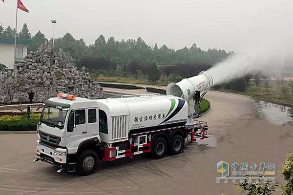 由于時值酷暑,現(xiàn)場臨時調(diào)用兩輛重汽濟南專用車公司生產(chǎn)的“綠葉”牌多功能抑塵車為酷暑下的運動員降溫助陣。