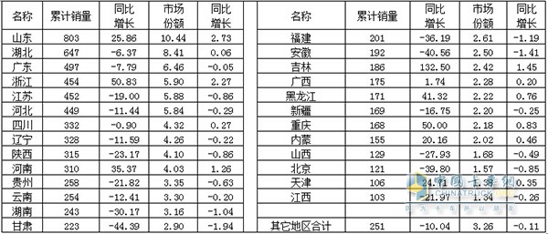 3、2015年全國灑水車累計銷量超過百輛省(市、自治區(qū))銷售情況