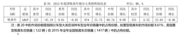 根據(jù)公安部車管所機動車上牌終端數(shù)據(jù),2015年我國累計完成吸糞車銷售1417輛,與上年同期(1341輛)相比增長5.67%;分大類看,中型吸糞車是市場需求的主力車型,全年累計完成銷售974輛,在2015年全國吸糞車總銷量(下同)中的占有份額達68%以上(詳見表20),同比提升9.08個百分點;重型最少,占有份額僅有8.61%。