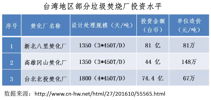 相較于目前大陸地區(qū)采用爐排爐工藝的垃圾焚燒電廠的噸投資成本(穩(wěn)定在40-52萬元)1,臺灣地區(qū)垃圾焚燒廠的單位造價成本遠高于大陸地區(qū)平均投資水平。