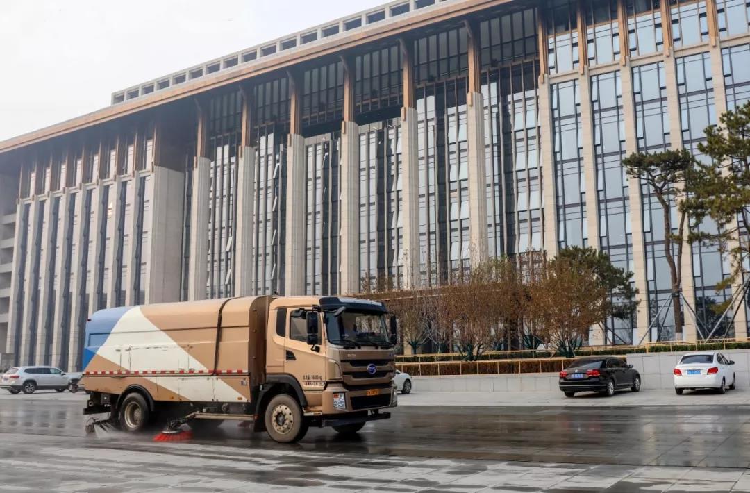 作業(yè)車輛在北京城市副中心進(jìn)行洗地作業(yè)