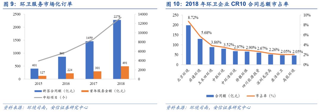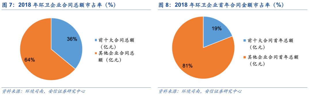 環(huán)衛(wèi)服務(wù)市場(chǎng)集中度較低,龍頭市占率有望提升。我國環(huán)衛(wèi)行業(yè)整體較為分散,呈現(xiàn)出參與者眾多、集中度低的現(xiàn)象。2018年環(huán)衛(wèi)企業(yè)CR10合同金額和首年金額市占率分別為36%、19%。還有較大提升空空間。