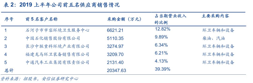 由于公司的業(yè)務(wù)區(qū)域較廣,同時(shí)市場(chǎng)上供應(yīng)商數(shù)量較多,所以公司的采購較為分散,不存在對(duì)單個(gè)供應(yīng)商的依賴。公司采購內(nèi)容主要包括機(jī)械設(shè)備(主要為環(huán)衛(wèi)車輛和清掃設(shè)備)、作業(yè)工具(如掃帚、鐵锨等)、工服、油料、保險(xiǎn)服務(wù)、勞務(wù)服務(wù)等。2019年上半年,公司向前五大供應(yīng)商的采購額為2.03億元,占總采購金額的比例為39.39%。