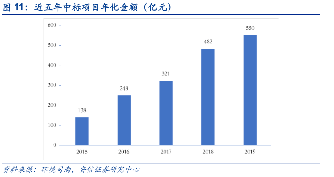 環(huán)境司南數(shù)據(jù)統(tǒng)計(jì)顯示,2019年度開標(biāo)項(xiàng)目年化總金額在550億元左右。從2015年138億到2019年550億,從百億級(jí)到五百億級(jí),短短五年時(shí)間,全國環(huán)衛(wèi)服務(wù)市場(chǎng)“中標(biāo)項(xiàng)目年化金額”一年一個(gè)臺(tái)階,可見環(huán)衛(wèi)行業(yè)市場(chǎng)空間和市場(chǎng)化程度快速發(fā)展。
