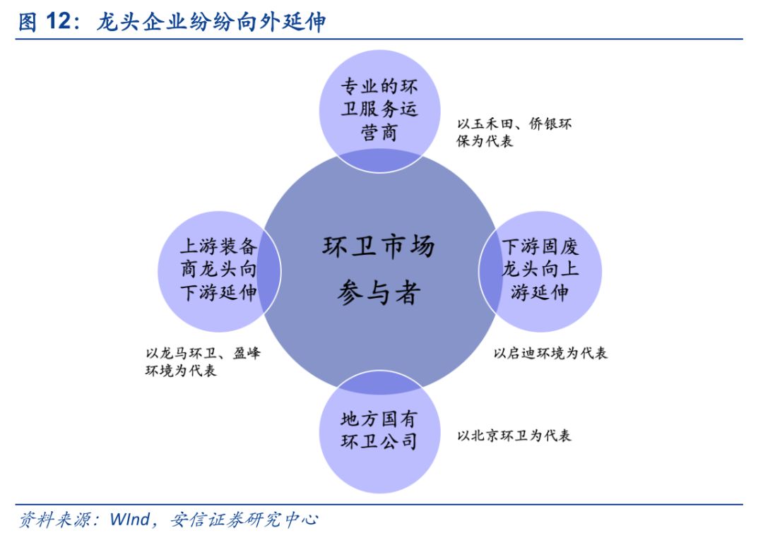 我們將目前環(huán)衛(wèi)市場(chǎng)主要參與者劃分為三種類型:“環(huán)衛(wèi)設(shè)備+環(huán)衛(wèi)服務(wù)”型企業(yè),“專業(yè)環(huán)衛(wèi)服務(wù)”型企業(yè),固廢綜合服務(wù)商,未來三類企業(yè)如果想進(jìn)一步打開自身的業(yè)務(wù)發(fā)展空間,進(jìn)行業(yè)務(wù)綜合化布局,向產(chǎn)業(yè)上下游延伸勢(shì)在必行。