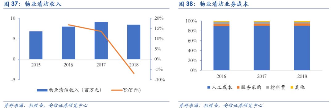 物業(yè)清潔服務(wù)是公司的傳統(tǒng)優(yōu)勢(shì)業(yè)務(wù),包括清潔服務(wù)、外墻清洗服務(wù)以及有害生物防治等,一般通過競(jìng)爭(zhēng)性談判或者招投標(biāo)等方式獲取業(yè)務(wù)合同,合同期限大多為 1-3 年。通過不斷的摸索以及經(jīng)驗(yàn)積累,玉禾田積累了大量長期合作的優(yōu)質(zhì)客戶,與廣州地鐵、深圳地鐵、萬科物業(yè)、華潤置地、龍湖物業(yè)、華僑城物業(yè)等保持長期穩(wěn)定的合作關(guān)系。2015-2018年公司在物業(yè)清潔業(yè)務(wù)收入分別為 6.8、8.0、9.1、8.5億元,增速逐年下滑,2018年已經(jīng)為負(fù)增長,盡管物業(yè)清潔業(yè)務(wù)份額逐年萎縮,但是整個(gè)物業(yè)管理市場(chǎng)仍有較大空間,公司未來發(fā)展戰(zhàn)略專注高端物業(yè)清潔。并且公司在物業(yè)清潔業(yè)務(wù)的營業(yè)成本主要由人工成本、服務(wù)采購、材料 費(fèi)構(gòu)成,且人工成本基本保持在90%左右,隨著人力成本的逐年增加,如何提高人均收入將是公司考慮的重點(diǎn)。