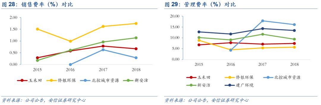 我們也從期間費(fèi)用端對(duì)比了以環(huán)衛(wèi)服務(wù)為主營業(yè)務(wù)的僑銀環(huán)保、北控城市、新安潔和建廣環(huán)境。2015-2018公司銷售費(fèi)率處于行業(yè)低位,2019年1-6月為0.69%,遠(yuǎn)低于行業(yè)平均值3.79%。主要原因是玉禾田管理人員除負(fù)責(zé)開拓項(xiàng)目以外,還負(fù)責(zé)項(xiàng)目運(yùn)營,相關(guān)職工薪酬一并計(jì)入管理費(fèi)用進(jìn)行核算,大大降低了銷售費(fèi)率。