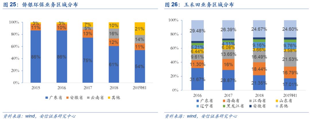 從業(yè)務(wù)區(qū)域分布上看,玉禾田的市政環(huán)衛(wèi)業(yè)務(wù)收入主要集中在廣東、海南、江西、遼寧、天津等地。僑銀環(huán)保的市政環(huán)衛(wèi)業(yè)務(wù)收入主要集中在廣東、安徽、云南等地。