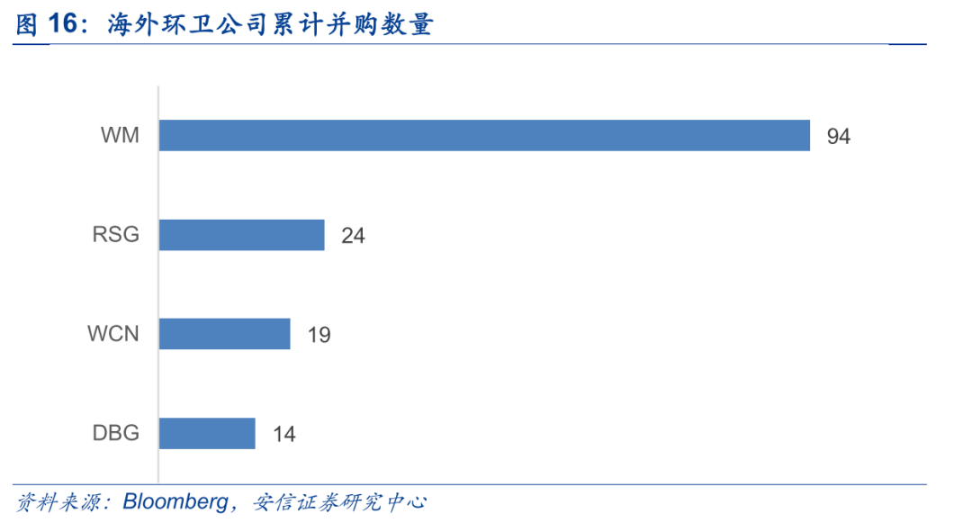 外部并購或是環(huán)衛(wèi)公司未來壯大的契機(jī)。對(duì)比海外,美國固廢巨頭廢品管理(WM)一直以來深諳外延收購的發(fā)展模式,成立之初便走向大舉外延道路。公司成立之初并購主要目標(biāo)為各地區(qū)小型垃圾收運(yùn)商。1968年公司便收購了伊利諾伊、威斯康辛和佛羅里達(dá)等地的小型垃圾收運(yùn)商,到上市之后的第二年,公司已經(jīng)收購了共133家小型固廢處理商,外延并購為公司新增收入達(dá)8200萬美元,更重要的是公司業(yè)務(wù)范圍由僅僅3個(gè)州擴(kuò)大到了美國19個(gè)州外加加拿大的魁北克、安大略兩省。借鑒WM的經(jīng)驗(yàn),我們可以看到對(duì)于環(huán)衛(wèi)企業(yè),若能夠打通環(huán)衛(wèi)-中轉(zhuǎn)-處理處置環(huán)節(jié),則有望實(shí)現(xiàn)資源優(yōu)化配置,優(yōu)化企業(yè)經(jīng)營效率。