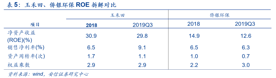 權(quán)益乘數(shù)反映了公司財(cái)務(wù)杠桿的大小,權(quán)益乘數(shù)越大,說明股東投入的資本在資產(chǎn)中所占的比重越小,財(cái)務(wù)杠桿越大。重點(diǎn)來看玉禾田和僑銀環(huán)保的權(quán)益乘數(shù)差別,在2019年之前,玉禾田的權(quán)益乘數(shù)均高于僑銀環(huán)保,在2019年僑銀反超后略高于玉禾田,且處于對(duì)比公司中最高值,這個(gè)趨勢(shì)也跟公司的資產(chǎn)負(fù)債率趨勢(shì)一一對(duì)應(yīng)。綜上分析,周轉(zhuǎn)率的差別才是玉禾田真正領(lǐng)先行業(yè)的主要原因。