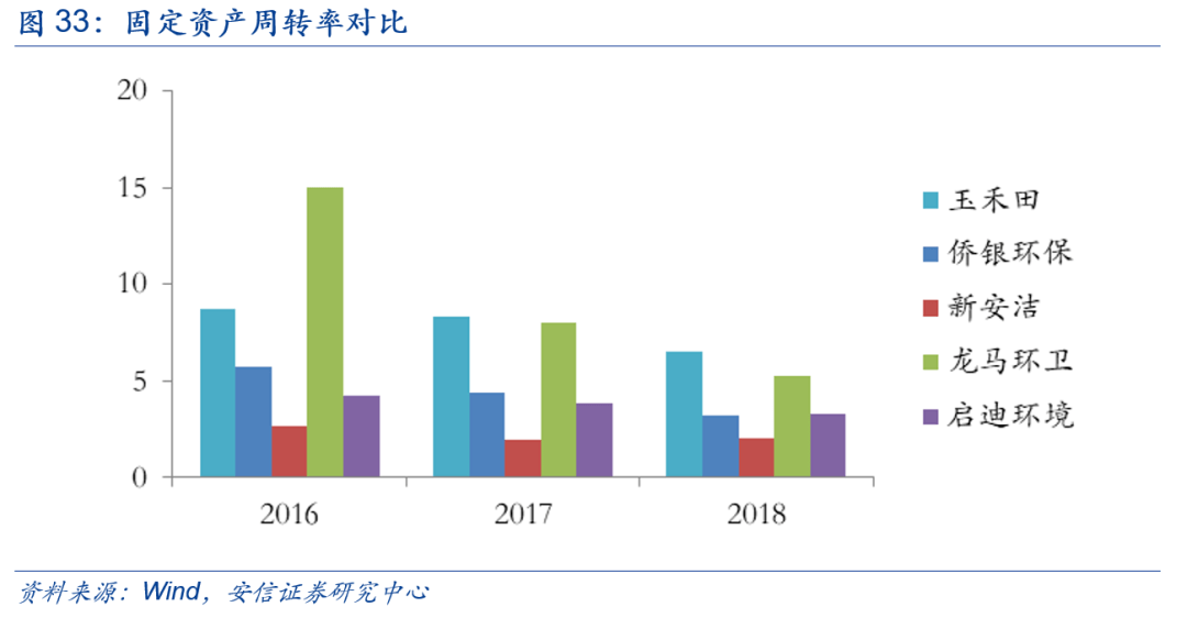 固定資產(chǎn)周轉(zhuǎn)率方面,公司也在同業(yè)可比公司中維持了較高水平。這主要得益于公司的輕資產(chǎn)業(yè)務(wù)模式。目前公司作業(yè)車輛及設(shè)備原值占固定資產(chǎn)原值比重在94%以上,主要是由于公司承接的市政環(huán)衛(wèi)項(xiàng)目在服務(wù)過程中需要使用大量的作業(yè)車輛和設(shè)備所致。這類基礎(chǔ)設(shè)備所需投入較少,且市政環(huán)衛(wèi)業(yè)務(wù)下的PPP項(xiàng)目,自進(jìn)場(chǎng)就有穩(wěn)定的收入現(xiàn)金流,沒有建設(shè)期或建設(shè)期很短,從而保證了公司較高的固定資產(chǎn)周轉(zhuǎn)率。對(duì)比之下,僑銀環(huán)保主營業(yè)務(wù)涵蓋城鄉(xiāng)環(huán)衛(wèi)保潔、生活垃圾收運(yùn)和填埋、滲濾液運(yùn)輸及處理、廚余垃圾收運(yùn)處理、園林綠化管養(yǎng)、市政管網(wǎng)維護(hù)、垃圾分類等全產(chǎn)業(yè)鏈,目前其運(yùn)輸設(shè)備占91.34%,另有機(jī)器設(shè)備占4.91%,需要設(shè)備投入量相對(duì)玉禾田更大,一定程度拉低了僑銀的固定資產(chǎn)周轉(zhuǎn)率。