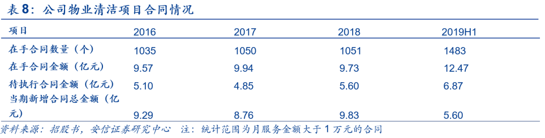 公司在手訂單合同數(shù)量較大,在手合同金額2019年保持快速增長,截止到2019年上半年,在手合同金額已超去年全年水平,隨著公司品牌形象的進(jìn)一步深化,物業(yè)清潔規(guī)模有望穩(wěn)健持續(xù)發(fā)展。
