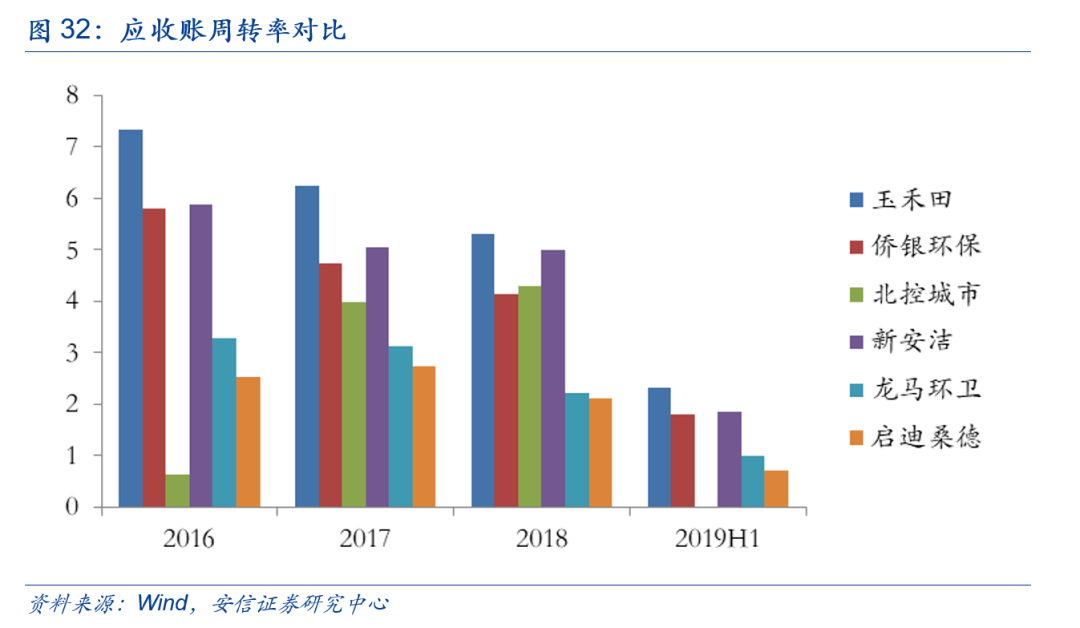 具體來看, 2016-2019H1期間,公司應(yīng)收賬款周轉(zhuǎn)率均處在行業(yè)高位。原因之一是龍馬環(huán)衛(wèi)(13.920, 0.45, 3.34%)、啟迪桑德等可比公司業(yè)務(wù)更為分散,如啟迪環(huán)境主營業(yè)務(wù)為市政施工、環(huán)保設(shè)備安裝及技術(shù)咨詢等,龍馬環(huán)衛(wèi)主營業(yè)務(wù)為環(huán)衛(wèi)裝備制造,而公司主要業(yè)務(wù)集中于市政環(huán)衛(wèi),收入結(jié)構(gòu)不同。目前公司市政環(huán)衛(wèi)業(yè)務(wù)處于大幅擴(kuò)張時(shí)期,公司各期末應(yīng)收賬款金額中,市政環(huán)衛(wèi)業(yè)務(wù)應(yīng)收賬款占比不斷提高。而市政環(huán)衛(wèi)業(yè)務(wù)合同約定的結(jié)算方式通常為:公司完成某月的服務(wù)內(nèi)容后,由客戶對(duì)上月的作業(yè)情況進(jìn)行考核,根據(jù)考核結(jié)果分月或分季度支付服務(wù)費(fèi)用,因此公司與客戶結(jié)算周期總體相對(duì)較短。