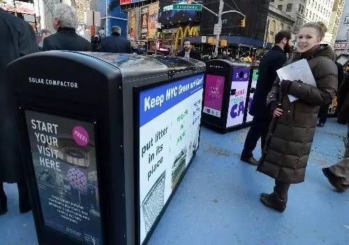 紐約的太陽(yáng)能垃圾箱帶有芯片,還配有一個(gè)回收再利用箱,上面印著金屬、玻璃、塑料,提醒大家按類別扔垃圾。