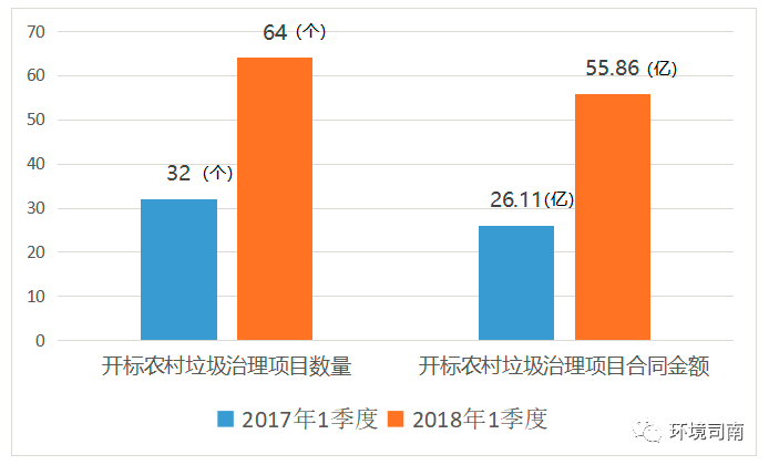 強制垃圾分類試點、農(nóng)村垃圾治理、農(nóng)村人居環(huán)境整治三年行動等相關(guān)政策的陸續(xù)出臺和持續(xù)推進,農(nóng)村垃圾治理、垃圾分類等非傳統(tǒng)環(huán)衛(wèi)項目不斷涌現(xiàn)。2018年1季度與去年同期相比,垃圾分類和農(nóng)村垃圾治理的項目數(shù)量和中標金額均出現(xiàn)倍增。