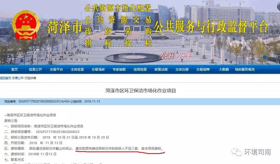 11月13日,菏澤市政府采購網(wǎng)發(fā)布菏澤市區(qū)環(huán)衛(wèi)保潔市場化作業(yè)項(xiàng)目廢標(biāo)公告:“因在遞交投標(biāo)文件截止時間止,遞交實(shí)質(zhì)性響應(yīng)招標(biāo)文件的投標(biāo)人不足三家,故本項(xiàng)目廢標(biāo)”……中標(biāo)交1億保證金!菏澤市區(qū)啟動大規(guī)模環(huán)衛(wèi)市場化改革