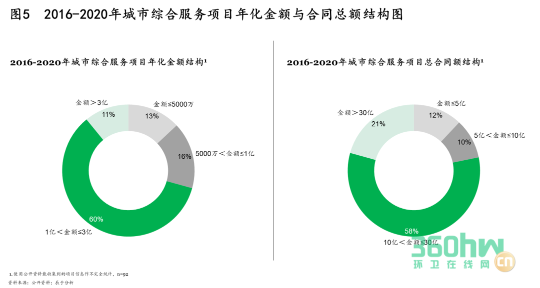 這類項(xiàng)目有助于企業(yè)快速形成規(guī)模與優(yōu)勢(shì),是環(huán)衛(wèi)企業(yè)制勝未來的首要選擇。從2016-2020年城市綜合服務(wù)項(xiàng)目年化金額及合同總額結(jié)構(gòu)圖中可以看出,大項(xiàng)目的年化金額與合同總額均占7成以上,因此相比爭奪數(shù)量多但金額少的小項(xiàng)目,獲得大項(xiàng)目對(duì)企業(yè)增收的意義更為突出(如圖5)。
