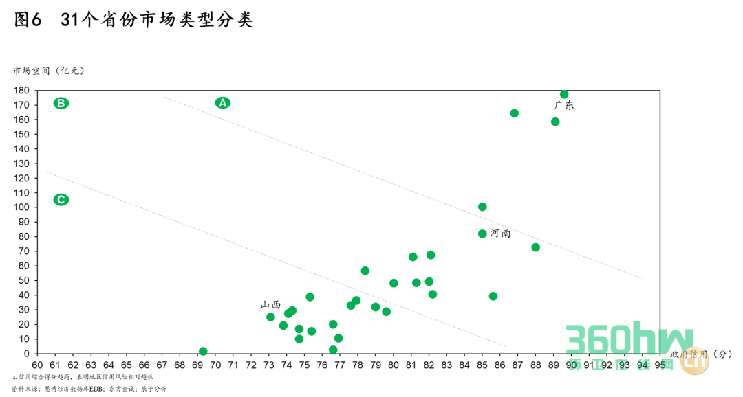 環(huán)衛(wèi)大單的產(chǎn)生不僅需要足夠的市場(chǎng)空間,而且需要當(dāng)?shù)卣休^強(qiáng)的財(cái)政支付能力,辰于采用市場(chǎng)空間和政府信用雙維度分析,建立以環(huán)衛(wèi)大單為目標(biāo)的區(qū)域評(píng)估模型(如圖6)。其中,東部省份(如廣東等)市場(chǎng)空間大,足以孕育出足夠的大金額項(xiàng)目,且政府信用相對(duì)較好,財(cái)政支付能力強(qiáng),債務(wù)風(fēng)險(xiǎn)低。關(guān)注大單的企業(yè)可以在該類地區(qū)多拿項(xiàng)目,并與政府保持密切的溝通和聯(lián)系,通過集群效應(yīng)、中心輻射效應(yīng),與政府合力催生出大項(xiàng)目。