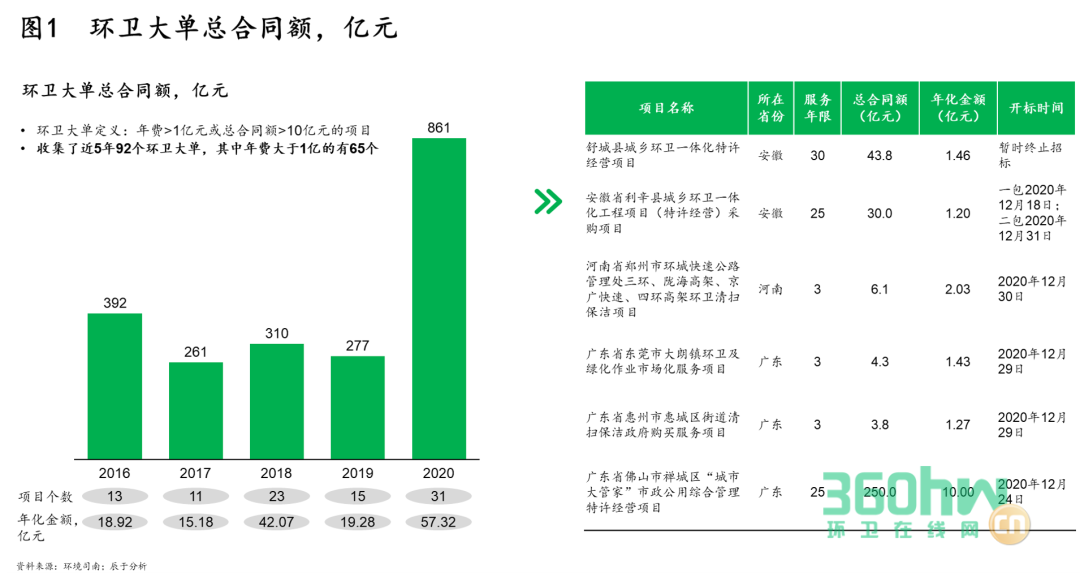 近年來,“大環(huán)衛(wèi)”訂單興起且頻頻出現(xiàn),成為各企業(yè)爭奪的關(guān)鍵(如圖1,數(shù)據(jù)時(shí)間截至2020年11月底)。從規(guī)模上看,環(huán)衛(wèi)大單頻出體現(xiàn)為合同金額的明顯增加、年化金額的不斷提升;從時(shí)間上看,表現(xiàn)為項(xiàng)目年限的顯著增長,5年及以上的環(huán)衛(wèi)項(xiàng)目比例逐漸增加;從內(nèi)容上看,由單一向綜合性轉(zhuǎn)變的趨勢(shì)凸顯;從形式上看,PPP模式項(xiàng)目的數(shù)量、比例不斷增加。如2019年的南安市城鄉(xiāng)生活垃圾環(huán)衛(wèi)一體化PPP項(xiàng)目,合同金額超22億元,年化金額達(dá)1.4億元,合作期限長達(dá)16年,服務(wù)范圍包括指定區(qū)域內(nèi)的道路清掃保潔、公廁維護(hù)、垃圾清轉(zhuǎn)運(yùn)、市政基礎(chǔ)設(shè)施維護(hù)、轉(zhuǎn)運(yùn)站等建設(shè)運(yùn)營等的廣泛內(nèi)容。2020年更是開出78億合同總額的大單——深圳市寶安區(qū)新安、福永和福海街道環(huán)衛(wèi)一體化PPP項(xiàng)目,其年化金額5.2億元,合作期限為期15年,服務(wù)范圍涵蓋道路綜合清掃保潔、垃圾收轉(zhuǎn)運(yùn)、轉(zhuǎn)運(yùn)站運(yùn)維管理、垃圾分類前端設(shè)施維護(hù)、公廁運(yùn)維管理、環(huán)衛(wèi)停車場(chǎng)建設(shè)運(yùn)維管理、綠化管養(yǎng)、智慧管理系統(tǒng)及平臺(tái)建設(shè)運(yùn)維、應(yīng)急保障等九個(gè)方面。