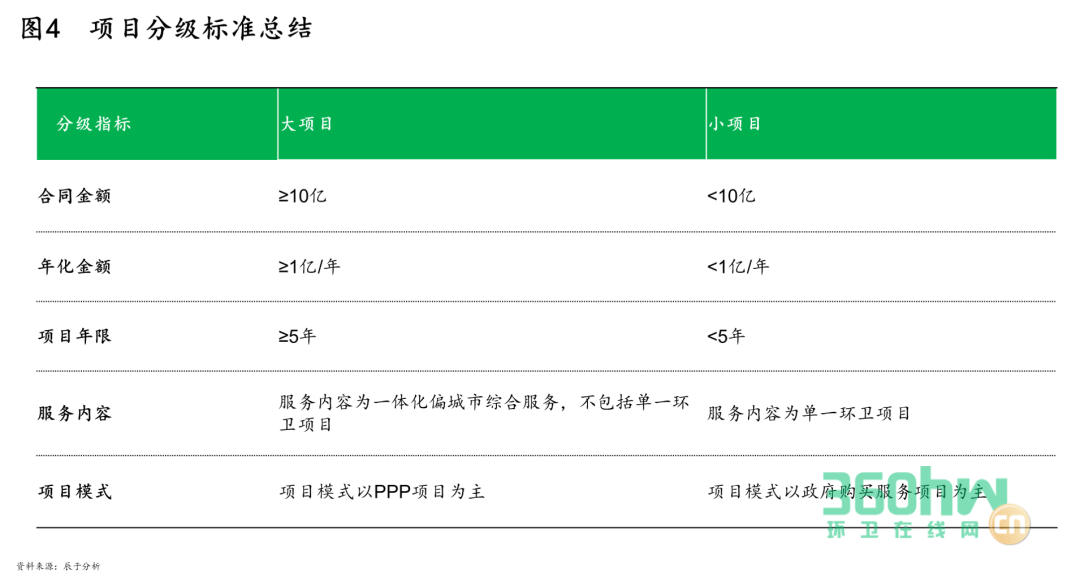 基于已有項(xiàng)目數(shù)據(jù),辰于從合同金額、年化金額、項(xiàng)目年限、服務(wù)內(nèi)容、項(xiàng)目模式這五個(gè)分級(jí)標(biāo)準(zhǔn)對(duì)“大項(xiàng)目”進(jìn)行界定區(qū)分(如圖4)。一般而言,滿足以下條件之一的環(huán)衛(wèi)項(xiàng)目即可稱為“大項(xiàng)目”:合同金額在10億以上;年化金額在1億以上;合作年限在5年以上。