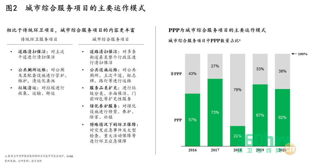 其二,PPP模式的采用,利用社會(huì)資本解決環(huán)衛(wèi)一體化項(xiàng)目的資金難題成為可能。相比于傳統(tǒng)環(huán)衛(wèi)項(xiàng)目,城市綜合服務(wù)項(xiàng)目的內(nèi)容更為豐富,對(duì)資金的要求也相應(yīng)提升,PPP模式的應(yīng)用為有效盤活現(xiàn)有環(huán)衛(wèi)資產(chǎn)提供思路,其也成為城市綜合服務(wù)項(xiàng)目的主要運(yùn)作模式,催生新一批的環(huán)衛(wèi)大單(如圖2)。