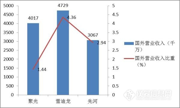 三家企業(yè)在國外市場的營業(yè)收入在3000-5000萬之間,占總營業(yè)收入的比例在1%-5%之間,說明對于三家企業(yè)來說,國外市場均涉及較少。