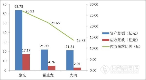 聚光在三家企業(yè)中資產(chǎn)總額最大,但應(yīng)收賬款占比也較高,為26.92%,主要是因為客戶為政府部門及大型工業(yè)企業(yè)。雪迪龍和先河資產(chǎn)總額、營業(yè)收入都類似,而雪迪龍客戶多為大型工業(yè)企業(yè),先河客戶多為政府部門,但先河環(huán)保應(yīng)收賬款比例較低。