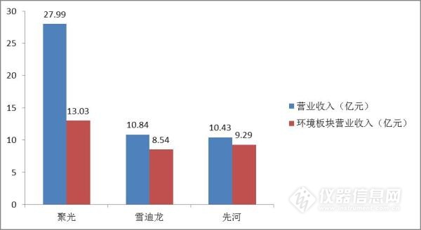 聚光科技目前的業(yè)務(wù)包括環(huán)境監(jiān)測系統(tǒng)及運(yùn)維咨詢服務(wù)、工業(yè)過程分析系統(tǒng)、實驗室分析儀器、水利水務(wù)工程系統(tǒng)和其他業(yè)務(wù),其中環(huán)境監(jiān)測系統(tǒng)包括環(huán)境空氣質(zhì)量監(jiān)測、水環(huán)境質(zhì)量監(jiān)測、水污染源監(jiān)測及其運(yùn)維咨詢服務(wù)。2017年聚光科技總營業(yè)收入為27.99億元,其中環(huán)境監(jiān)測業(yè)務(wù)板塊為13.03億元,比上年同期增長36.71%。