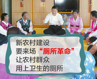 2015年7月16日,總書記在吉林省延邊州調(diào)研。當(dāng)?shù)弥恍┐迕襁€在使用傳統(tǒng)的旱廁,他指出,隨著農(nóng)業(yè)現(xiàn)代化步伐加快,新農(nóng)村建設(shè)也要不斷推進(jìn),要來個(gè)“廁所革命”,讓農(nóng)村群眾用上衛(wèi)生的廁所。