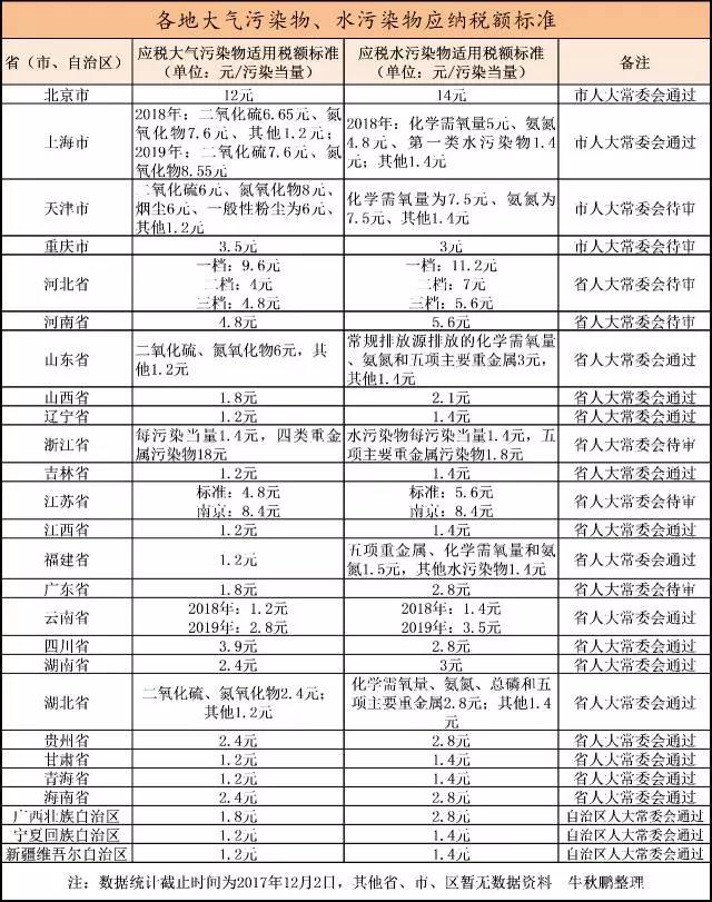 大氣污染物適用稅額為每污染當(dāng)量1.2元,水污染物適用稅額為每污染當(dāng)量1.4元。(已通過省人大表決)
