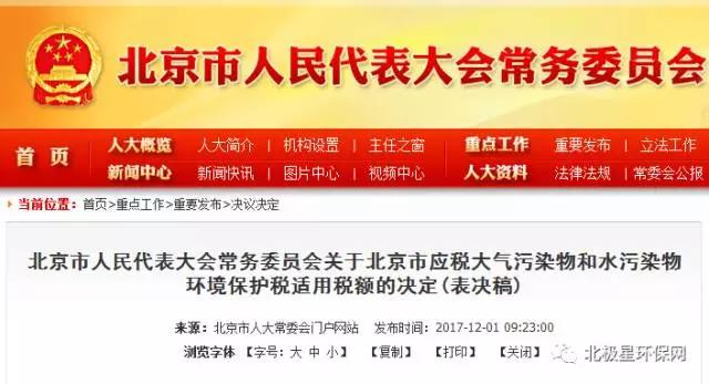 近日,北京市十四屆人大常委會(huì)第四十二次會(huì)議決定,北京應(yīng)稅大氣污染物適用稅額標(biāo)準(zhǔn)為12元/污染當(dāng)量;應(yīng)稅水污染物適用稅額標(biāo)準(zhǔn)為14元/污染當(dāng)量,統(tǒng)一按法定幅度的上限執(zhí)行。