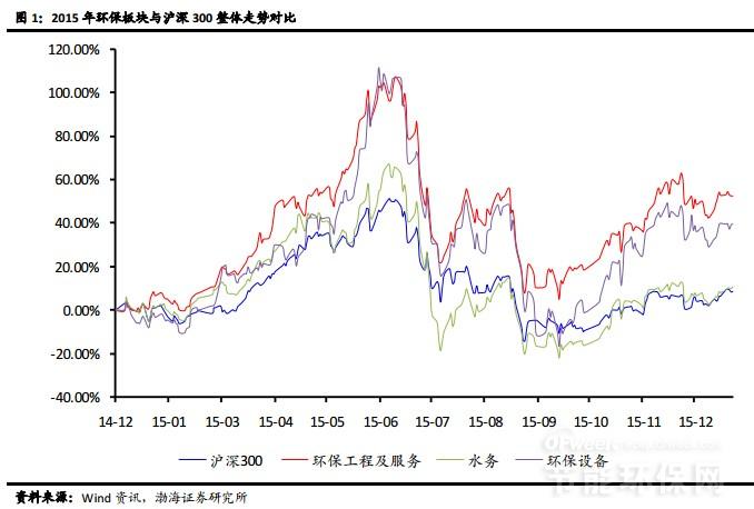 2015年,環(huán)保板塊在政策刺激、事件催化、業(yè)績利好提振等因素的作用下,總體走強,表現(xiàn)好于大市。截至2015年12月25日,環(huán)保工程及服務指數(shù)、環(huán)保設備指數(shù)、以及水務指數(shù)分別上漲52.74%、39.54%和10.56%,分別跑贏大盤(滬深300)44.12、30.92和1.94個百分點。