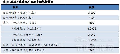 根據(jù)住建部數(shù)據(jù),目前約有3,000座的城鎮(zhèn)污水處理廠出水水質(zhì)低于一級A標準,其污水日處理能力為1.258億立方米,暫不考慮特別排放限值要求,若以一級A作為統(tǒng)一改造標準,改造成本以從一級B提升到一級A的標準、按單價750元/立方米估守估計,則初步匡算完成所這些污水廠改造所需的投入為943億元。假設現(xiàn)有3,000多座污水廠中敏感地區(qū)污水廠的處理能力占比為50%,則敏感地區(qū)現(xiàn)有污水處理廠完成全部提標改造,對應的市場規(guī)模為472億元,這部分需求預計將于未來兩年集中釋放。