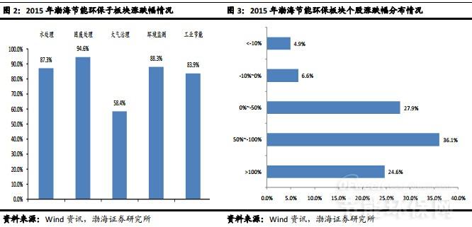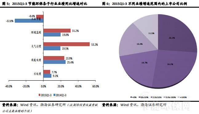 在政策持續(xù)加碼、監(jiān)管執(zhí)法強化以及創(chuàng)新模式推動等作用下,環(huán)保訂單加快釋放并實現(xiàn)業(yè)績兌現(xiàn),行業(yè)整體保持較快增長。2015年前3季度,渤海節(jié)能環(huán)保板塊,整體盈利增速約16.6%,比去年同期同比增速高8個百分點。各細分子行業(yè)板塊,除水處理(含水務運營和水處理工程及設備)、固廢處理盈利增速與去年同期增速相比略微降低外,其余子板塊中,大氣治理和環(huán)境監(jiān)測盈利增速分別為53.2%和31.2%,分別比各自去年同期增速增加了約34個百分點和11個百分點;而工業(yè)節(jié)能板塊盈利增速-8.4%,下滑趨勢明顯減緩。在個股方面,前3季度,近一半的上市公司盈利增速超過30%,其中約28.0%的個股盈利增速則超過50%。所有上市公司中,除國中水務因核心管理團隊出現(xiàn)重大變動等原因,導致公司業(yè)績出現(xiàn)虧損外,其余的凈利潤均為正數(shù)。從目前國家推進環(huán)境治理的力度來看,我們認為行業(yè)全年業(yè)績大概率將實現(xiàn)較高增長,同時,考慮到環(huán)?!笆濉币?guī)劃收官之年的沖刺效應,預計行業(yè)全年業(yè)績增速有超預期的可能。