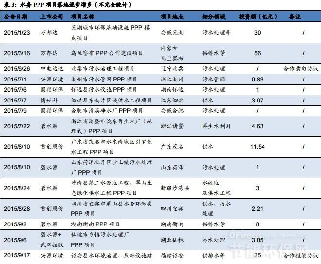 在財政部首批30個PPP示范項目中,環(huán)保類項目共15個,其中供排水項目為12個,占比達到80%;第二批206個示范項目中,環(huán)保類項目共66個,其中供排水項目27個,占比超過40%。此外,在國家發(fā)改委推介的兩批PPP項目庫中,供排水項目同樣在環(huán)保類項目中占多數(shù)。而隨著政策的持續(xù)引導和推動,越來越多的水務PPP項目開始落地。我們認為,PPP模式的推廣,將加速潛在水務項目需求的釋放,進而將不斷推升水務行業(yè)的景氣度。