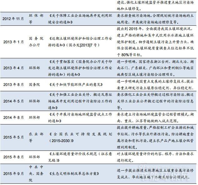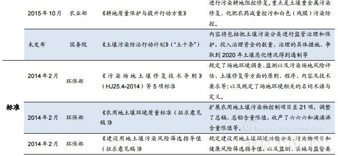 2012年11月《關于保障工業(yè)企業(yè)場地再開發(fā)利用環(huán)境安全的通知》下發(fā),文件明確被污染場地再次開發(fā)利用的相關要求。2013年1月國務院發(fā)布《近期土壤環(huán)境保護和綜合治理工作安排的通知》,提出2015年及2020年土壤環(huán)境保護和綜合治理的工作目標和主要任務。2014年8月環(huán)保部《關于開展污染場地環(huán)境監(jiān)管試點工作的通知》則進一步強化了對污染場地的監(jiān)管要求。此外,2015年5月出臺的《全國農(nóng)業(yè)可持續(xù)發(fā)展規(guī)劃(2015-2030)》和10月出臺的《耕地質(zhì)量保護與提升方案》均明確對耕地質(zhì)量的保護和進行污染土壤修復。目前倍受期待的“土十條”,據(jù)媒體報道,已提交國務院審議,預計將于2016年出臺?!巴潦畻l”將會制定土壤污染治理的具體“時間表”,內(nèi)容包括把土壤污染分類進行監(jiān)管治理和保護,投入治理資金的數(shù)量、治理的具體措施,爭取到2020年土壤惡化情況得到遏制。
