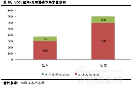 從目前出臺的政策看,石油石化、包裝印刷等行業(yè)已被列為VOCs防治重點和優(yōu)先領域,隨著政策的推進,這些行業(yè)的VOCs治理將加快展開。僅考慮石油石化和包裝印刷兩個重點行業(yè),我們測算VOCs監(jiān)測+治理的潛在市場空間約1,100億元,其中預計“十三五”期間市場規(guī)模約750億元。