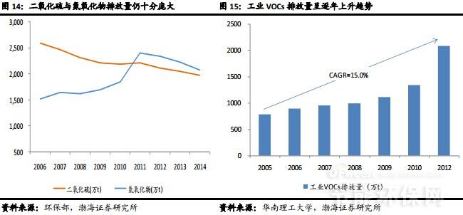 從大氣主要污染物排放情況看,2014年二氧化硫、氮氧化物的排放量分別為1,974萬噸和2,078萬噸,而PM2.5和O3形成的重要前體物揮發(fā)性有機物VOCs的排放量估計也在2,000萬噸以上。依然龐大的污染物排放量,或遠超環(huán)境容量,成為大氣環(huán)境質(zhì)量無法根本性改善的原因。因此,解決大氣污染問題,加大治理力度、加快削減這些主要大氣污染物尤為關鍵,也將是迫切需求。
