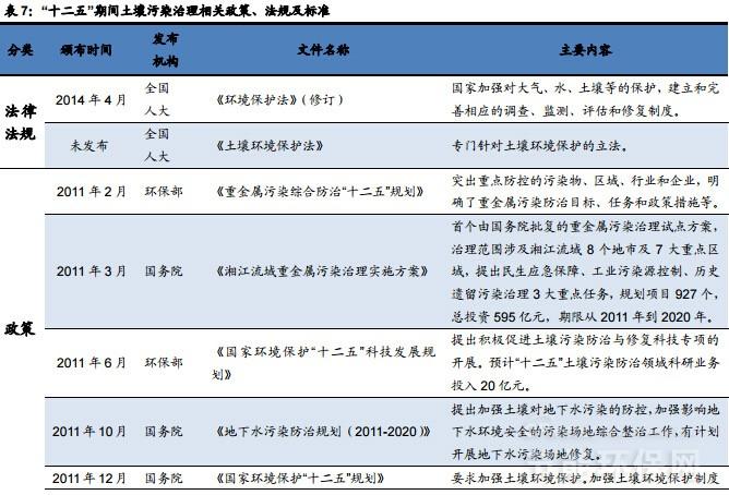 鑒于土壤污染問題的日益加劇,國家對土壤污染的防治重視程度也在不斷提高,“十二五”期間,國家加大在土壤立法、政策制定、標準體系建設等方面的推進力度,相關文件頻繁出臺。