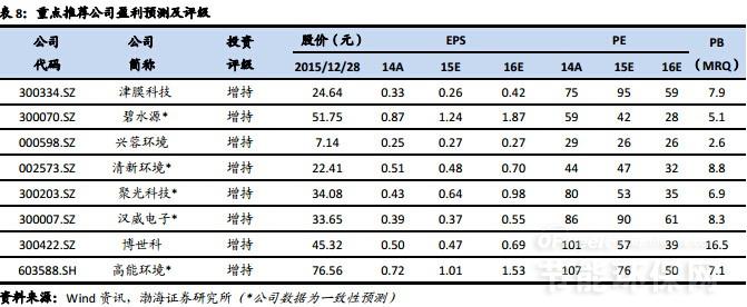“十三五”期間,環(huán)境保護將以提高環(huán)境質(zhì)量為核心,氣水土三大行動計劃有望全面推進深入實施,在此帶動下,環(huán)保行業(yè)將持續(xù)高景氣度。我們維持行業(yè)“看好”的投資評級。作為環(huán)?!笆濉遍_局和承上啟下的關鍵之年,2016年預計環(huán)境治理將重點圍繞三大環(huán)境戰(zhàn)役展開,各重點治理細分領域有望獲政策持續(xù)加碼推動而加速發(fā)展,因此,建議以三大行動計劃為主線,著眼于市場潛力大、行業(yè)發(fā)展將提速的細分領域,來把握相關的投資機會?!八畻l”實施方面,看好城鎮(zhèn)污水處理廠提標改造以及水務市場發(fā)展;“大氣十條”推進上,看好煤電超低排放改造和揮發(fā)性有機物VOCs治理細分領域成長。同時,看好即將出臺的“土十條”對土壤修復市場的推動。推薦標的:1)津膜科技(膜法水資源化龍頭,核心技術領先;加快業(yè)務模式轉型;業(yè)績有望觸底反彈)、2)碧水源(MBR膜技術龍頭,PPP市場領先者;市場開拓能力超群;訂單儲備充沛)、3)興蓉環(huán)境(區(qū)域領先的水務環(huán)境綜合服務提供商,業(yè)務拓展和國企改革有望加快);4)清新環(huán)境(火電煙氣治理龍頭,擁有超低排放核心技術)、5)聚光科技(環(huán)境監(jiān)測龍頭,具有VOCs監(jiān)測與治理一體化優(yōu)勢)、6)漢威電子(國內(nèi)氣體傳感器龍頭,收購嘉園環(huán)保切入VOCs治理領域);7)高能環(huán)境(生態(tài)屏障與環(huán)境修復解決方案提供商,土壤修復領域最純正標的)、8)博世科(工業(yè)水處理領先者,擁有重金屬修復項目經(jīng)驗和土壤修復技術儲備,成立專門事業(yè)部,加大布局環(huán)境修復市場)。