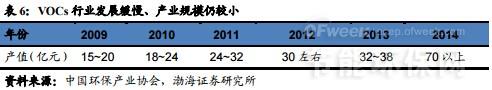 較長時間以來,我國大氣污染治理的重點主要是放在除塵、脫硫和脫硝方面,對于揮發(fā)性有機物VOCs的治理并未引起足夠的重視。由于政策法規(guī)、監(jiān)測標準及制度管理體系等不健全,我國VOCs治理行業(yè)發(fā)展遲緩,產(chǎn)業(yè)規(guī)模較小。根據(jù)中國環(huán)境保護產(chǎn)業(yè)協(xié)會的調(diào)查估算,2014年全國VOCs治理行業(yè)總產(chǎn)值約70多億元,雖同比有較快增長,但規(guī)模尚不足百億、仍舊很??;而在2009-2013年的5年間,行業(yè)總產(chǎn)值僅在15-40億之間,年復合增長率則在20%左右??傮w而言,目前我國VOCs治理行業(yè)正處于起步成長階段。